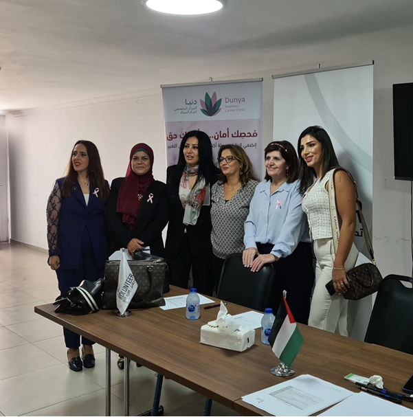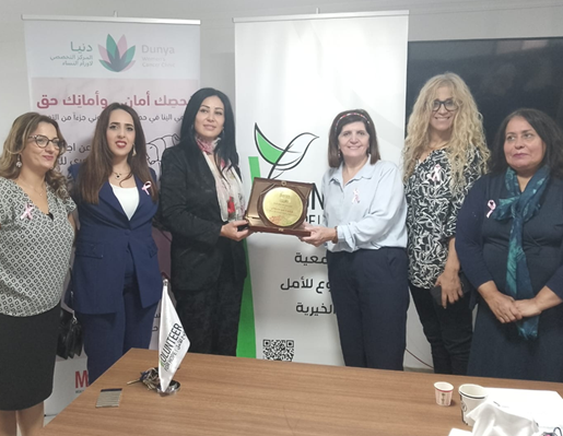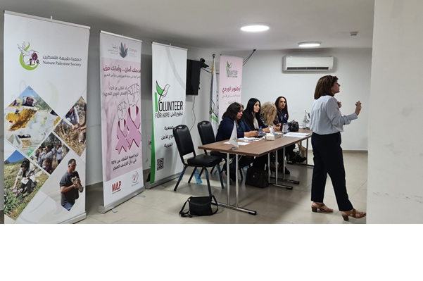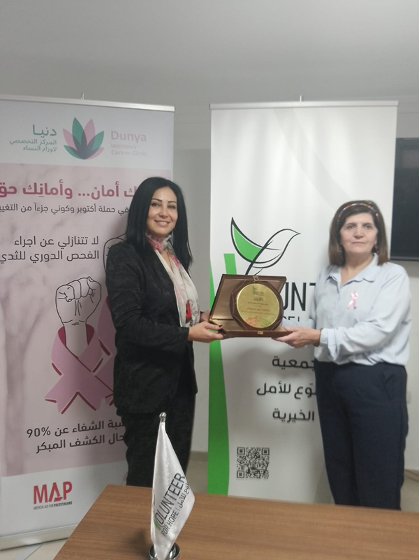 During the event, Dr. Nafouz Al-Muslimani, Director of Dunya Women’s Cancer Center, was honored for her outstanding efforts in raising community awareness about breast cancer. Additionally, Dr. Yara Dahdal, Program Director at the Nature of Palestine Association, was recognized for her role in highlighting the link between environmental pollution, harmful practices, and increased health risks, as well as for her efforts to mitigate them.